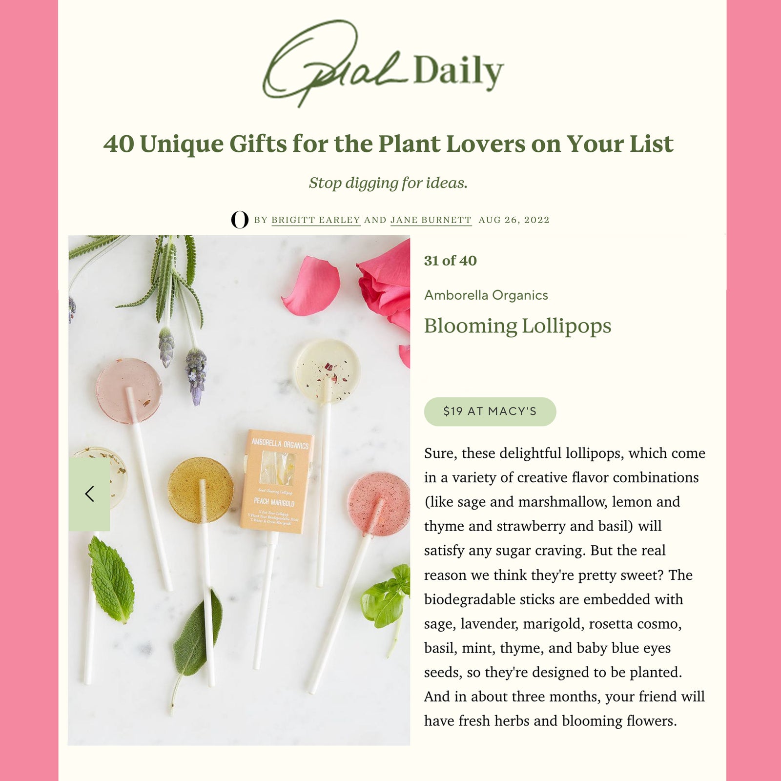 “Sure, these delightful lollipops, which come in a variety of creative flavor combinations will satisfy any sugar craving. But the real reason we think they’re pretty sweet? The biodegradable sticks are embedded with sage, lavender, and marigold, so they’re designed to be planted.”